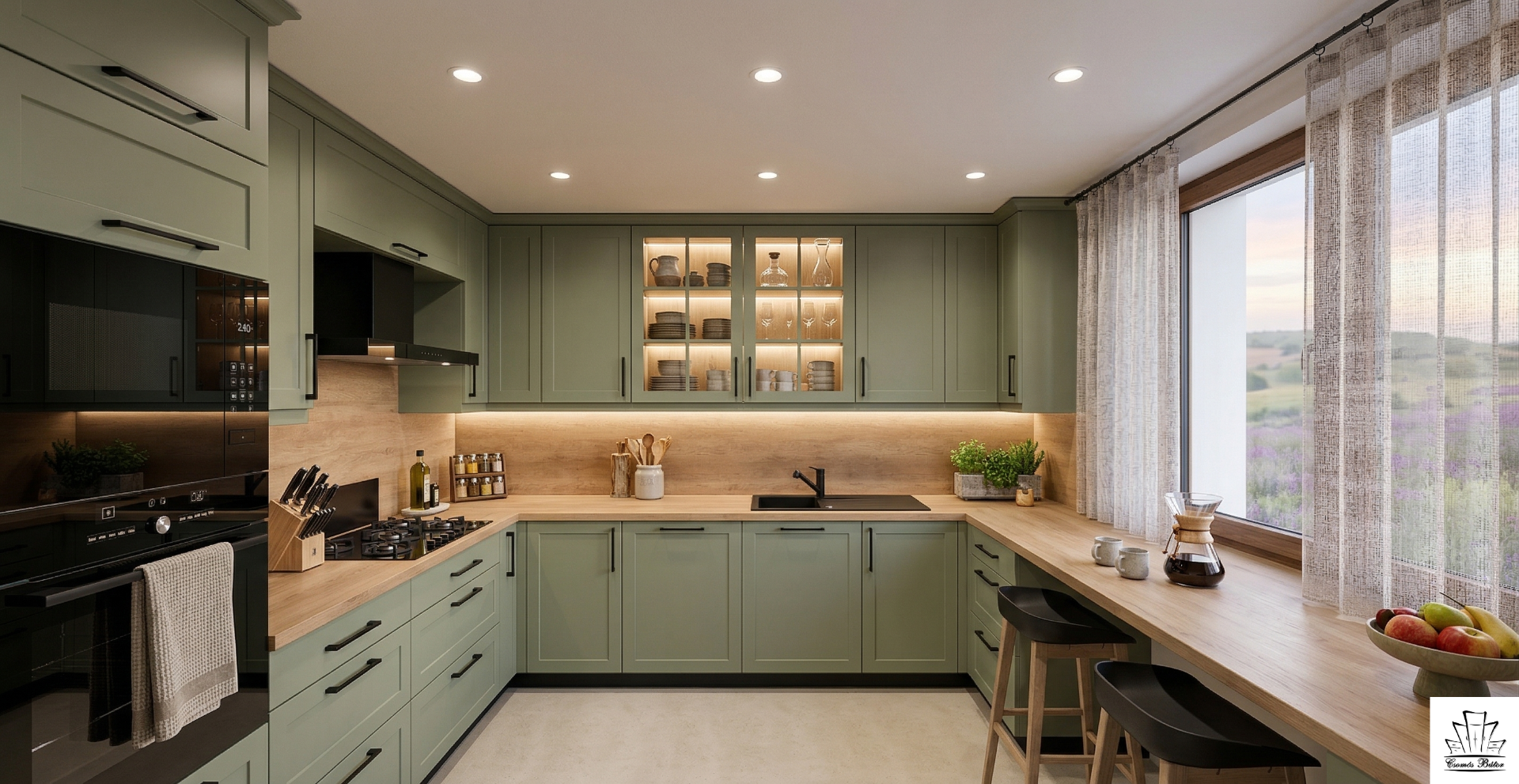 Szlovákiába Anikónak terveztem egy pesto zöld rusztikus hangulatú, de modern konyhát 13 m2-re. A felújítás már javában zajlik, így igyekeztünk a konyha megtervezésével. A mosogató és a főzőlap helye fix, maradnak azon a falon, ahol a kiállások eddig is voltak. Az igény egy kis reggeliző pult volt, ami szerintem az ablak előtt tökéletes helyen lesz. A felkelő nap fényénél kávézni és közben az udvart szemlélni kellemes dolog reggelenként. 😊