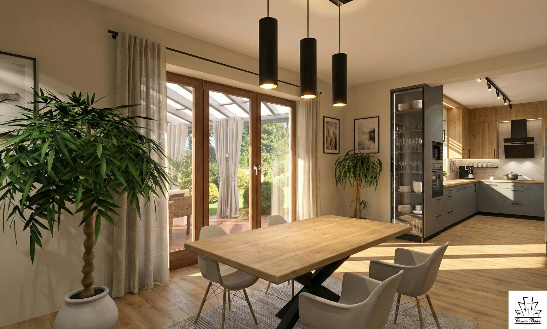 Esztinek volt egy hatalmas ötlete. A side by side hűtőnek az építésszel terveztetett a falba egy beugrót, -igaz, hogy a kamra rovására-, de így hatalmas mérete ellenére is szinte észrevehetetlen. A nagy kérdés még a "kilőni" fal volt, de végül az is mehetett, így lehet egy vitrines szekrény a konyha végében arccal az étkező felé. Ez pedig feltette a pontot az i-re! 😊