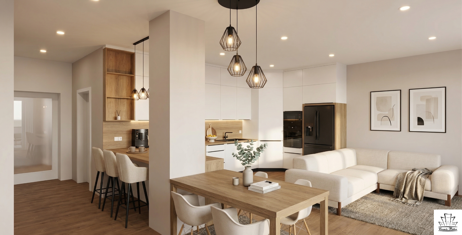központi helye egybenyitva. Itt lesz a konyha-étkező-nappali. Egy oszlopnak