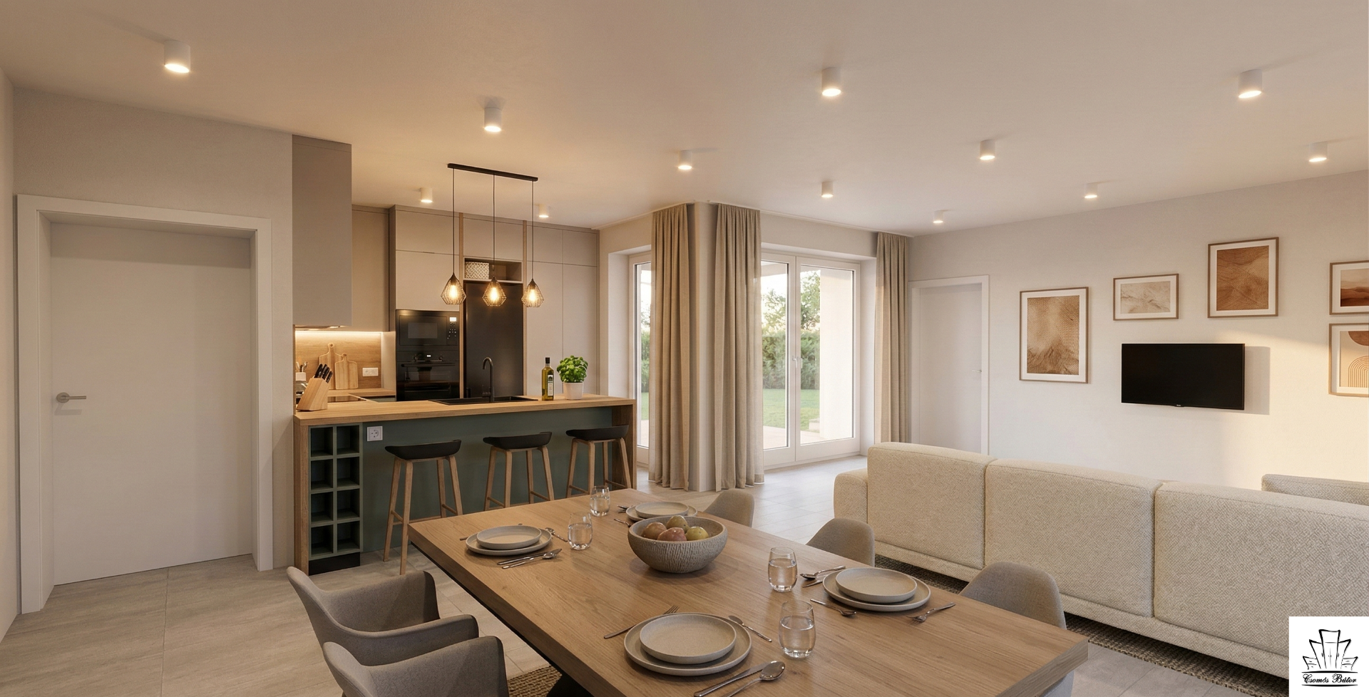 A párjának nagyon tetszik a szekrénynek álcázott kamrabejárat, ezért a konyha földig érő 1800 mm széles kétszárnyú teraszajtaját kicserélik egy 900-1000 mm széles ajtóra. Így már lehet a konyha jobb sarkában egy "Narnia" ajtó, amivel tökéletes lett az összhang. 😊