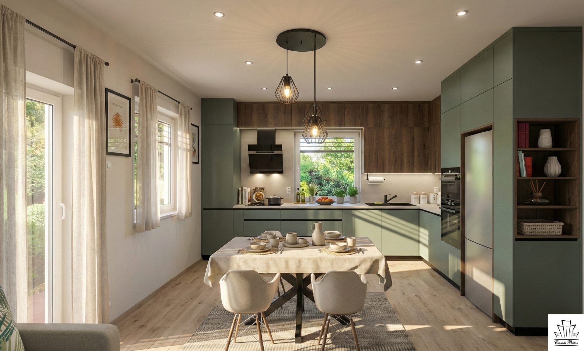 Szilviék esetében volt lehetőségem több elrendezést is bemutatni. Volt L alak szigettel és asztallal, volt párhuzamos konyha szigettel és asztallal és volt L alak csak asztallal. A harmadik elrendezés nyert, hogy a helyiség szellősebb legyen és így is lesz elég szekrényük. A felújítás már javában tart, így igyekeznünk kellett. Amikor testet ölt a lehetséges konyha, akkor derül ki sok olyan dolog, amire egyébként nem gondolunk. Jelen esetben a beépíthető páraelszívó helyett inkább egy különálló mellett döntöttek Szilviék, mert így szellősebb és mutatósabb a konyha. A hűtő köré egy keretet javasoltam, amin ment a vita egy darabig, de Szilvi győzött. :D A nappali felé fordított polcos szekrény is volt már zöld is meg barna is, több polcos is meg kevesebb is. Viszont, ha látható 3D-ben, mennyivel könnyebb dönteni?